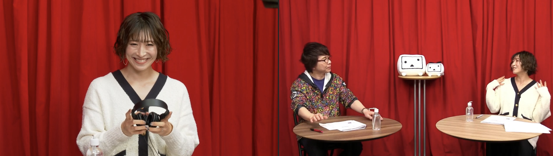 本番さながらスタジオにはダミーヘッドマイクが設置。名塚にもヘッドホンが渡され、置鮎の生収録を視聴者と一緒に楽しみます。実はダミーヘッドマイクで収録されたボイスを聴くのは初めてだという名塚。置鮎も「じゃあ貴女の初めてになりましょう!」とノリノリです。