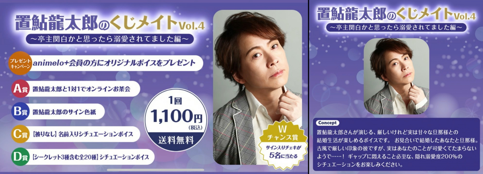 今回のくじメイトテーマは「亭主関白かと思ったら溺愛されてました」。コンセプトは「置鮎演じる厳しいけれど実は甘々な旦那様との結婚生活」。古風で厳しい旦那様のギャップに悶えること間違いなしの溺愛200%シチュエーションです。