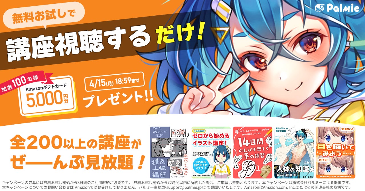 パルミーは、イラストやマンガの描き方を動画で学べるオンライン教室です。イラストレーターや漫画家、アニメーター、専門学校講師など、多くの「プロ」が講師を務めています。月額定額制(サブスク)で授業が受けられる「月謝制」は、累計利用者数20,000名を突破しました。パルミーの無料お試しでは7日間、全200以上の講座を無料で視聴いただけます。
