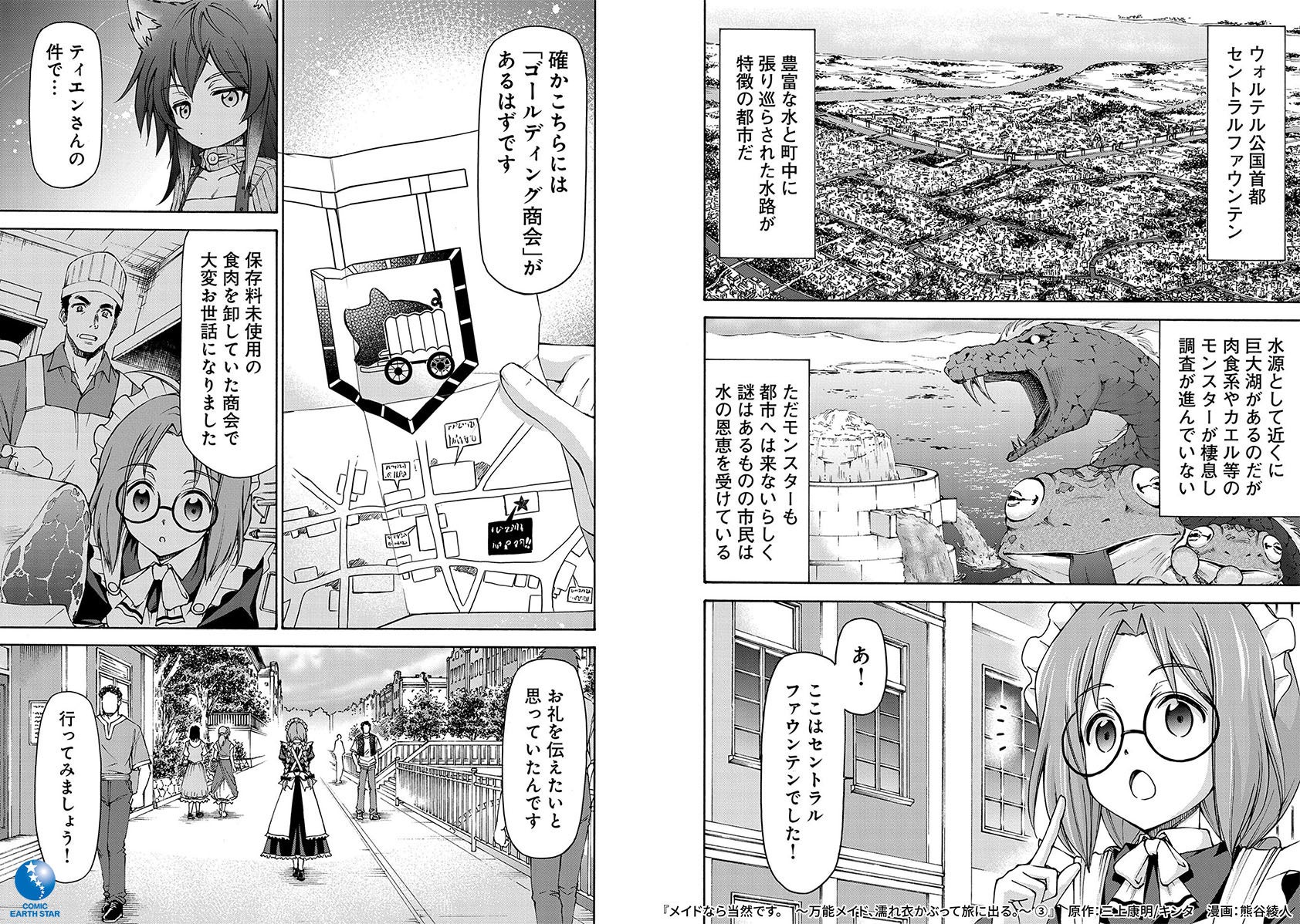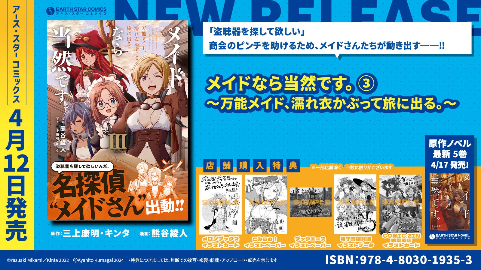 アース・スターノベルにて刊行中のノベルが原作で、現在コミック アース・スター公式サイトにて連載中の人気作品『メイドなら当然です。 ~万能メイド、濡れ衣かぶって旅に出る。~』(原作:三上康明/キンタ 漫画:熊谷綾人)第3巻を4月12日(水)に発売いたします。