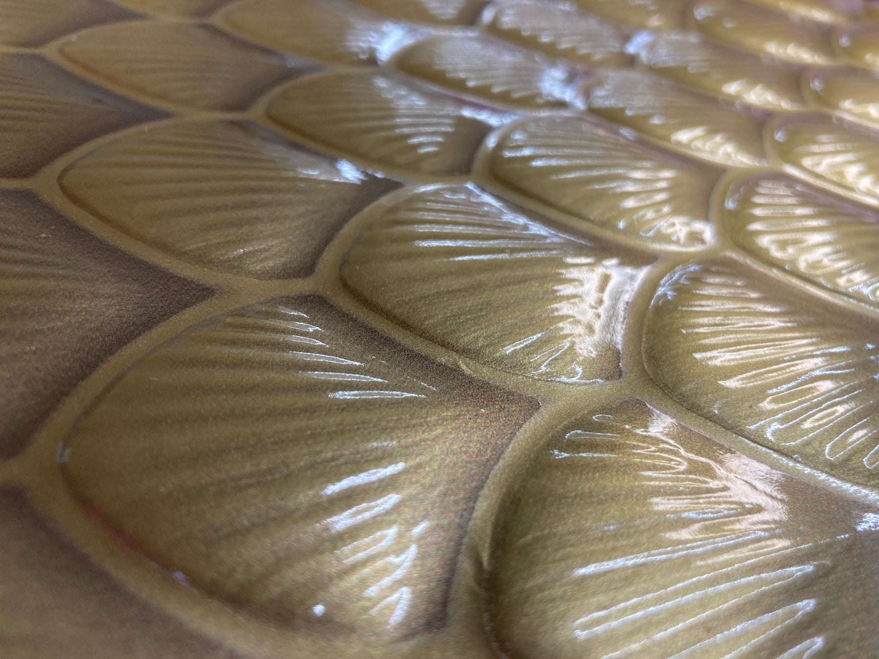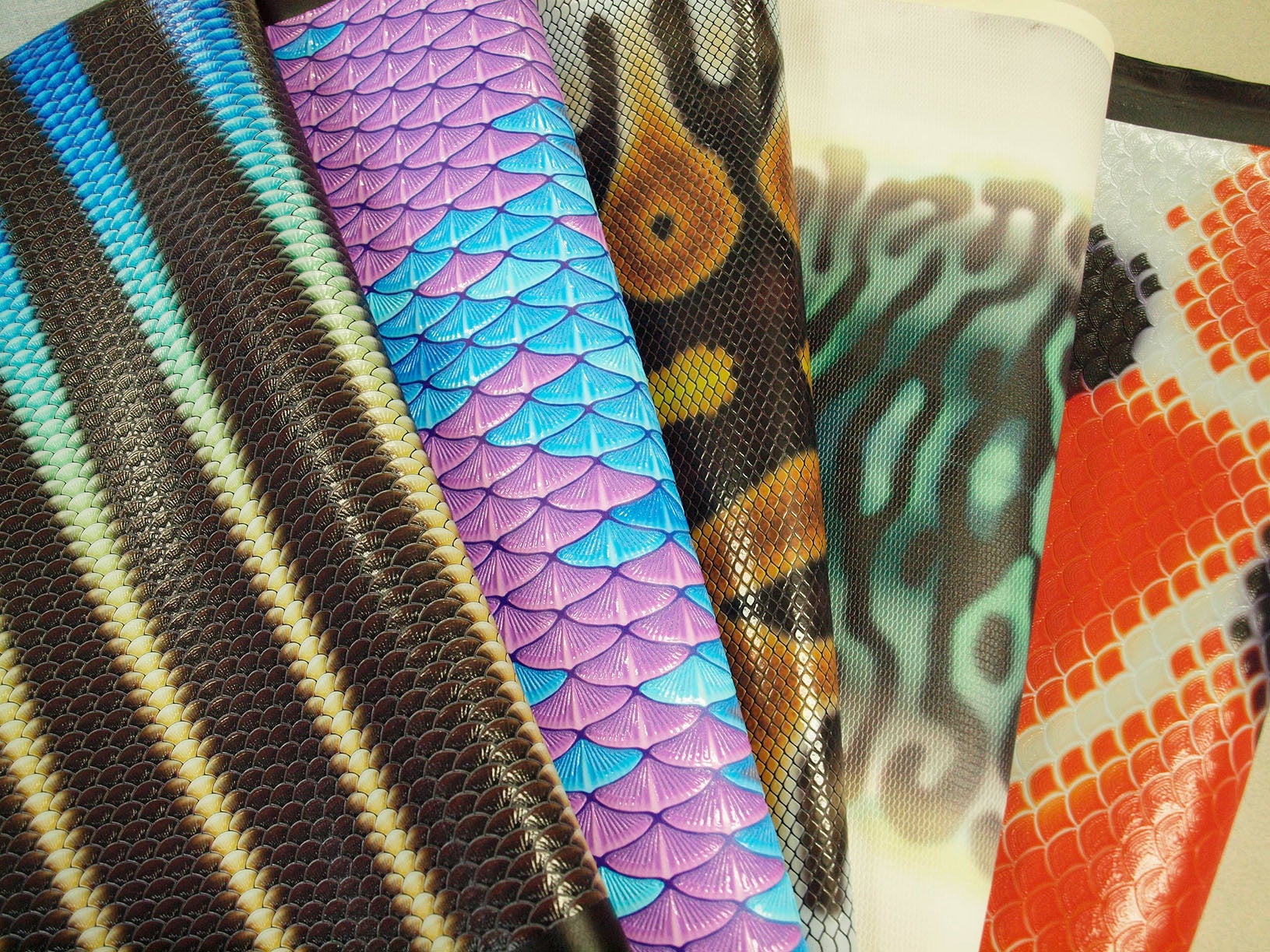 また人工皮革の上にプリントを重ねることで表面の凹凸をさらに深くしたリアルなフェイクレザーを再現します。この2.5Dプリント技術により、生物の鱗などの表皮を立体的に再現可能で、空想上の生物だけでなく、植物・イラストなどありとあらゆるもののフェイクレザーを製造することが可能です。