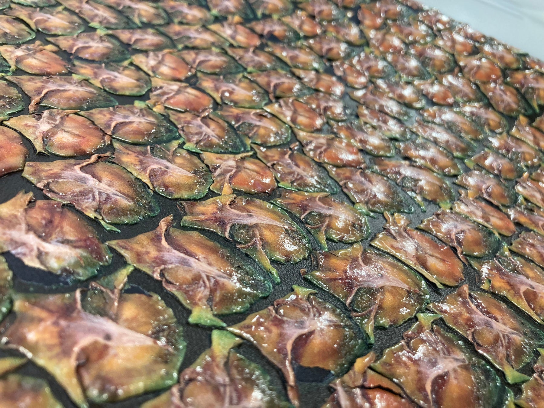 2.5Dプリントサービスを用いたドラゴンの鱗風フェイクレザーやパイナップル皮の布用シールなどを展示・店頭販売致します。