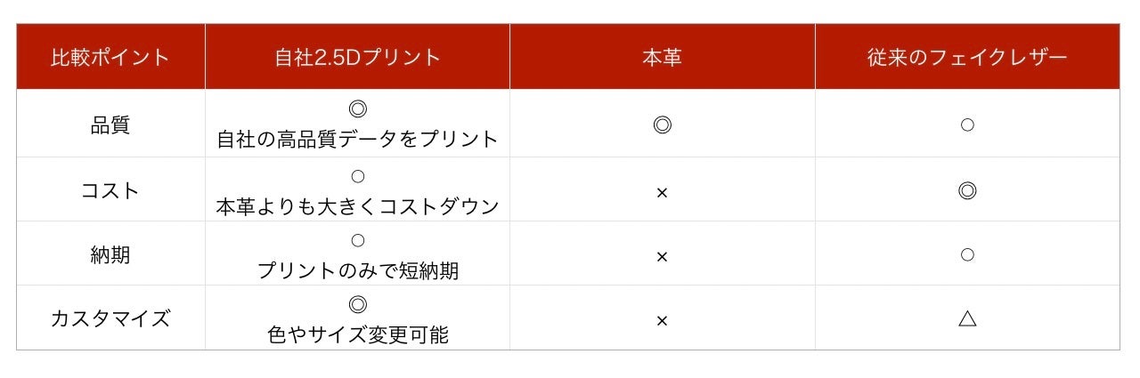 従来の型押しのフェイクレザーに比べ凹凸や光沢、カラーバリエーションなどの自由度が高いことが特徴です。