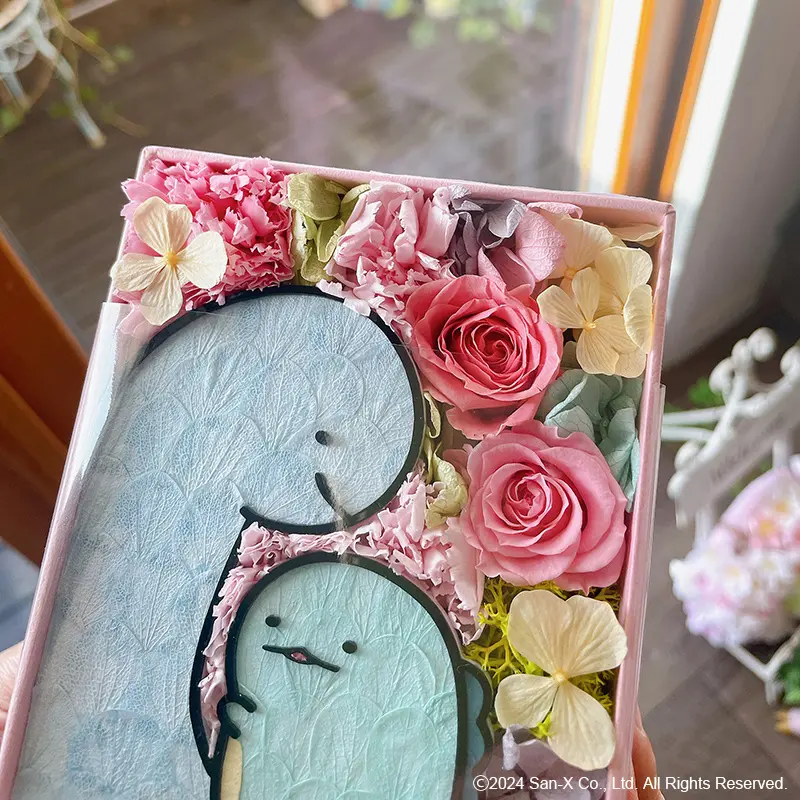 「すみっコぐらし フラワーコレクション」は、バラやかすみ草、あじさい、カーネーションなどのプリザーブドフラワーを使って、かわいいすみっコたちを描いたフラワーBOX。キャラクターがお花のすみっこにいるような構図が楽しい「まるBOX」や、横に並べて作品が大きくなっていく楽しさが味わえる「しかくBOX」、お部屋の壁やおうちのドアなどに飾れる「フラワーリース」などをこれまで制作してきました。
