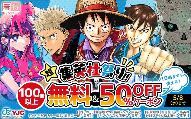 集英社マンガ58作品・100冊以上を対象に閲覧期限あり無料版の配信、ならびに1作品10巻まで50%OFFで購入できるクーポンを配布いたします。詳細はキャンペーンページをご確認ください。
