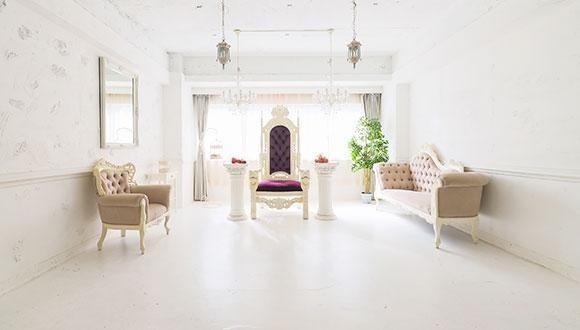 白を基調としたゴージャスな装飾にこだわったホワイトゴシックスタジオです。デコラティブなソファーや、キングチェアー・大鏡も設置してあります。自然光も十分に差し込みますので、照明とはまた違った雰囲気をお楽しみいただけます。
