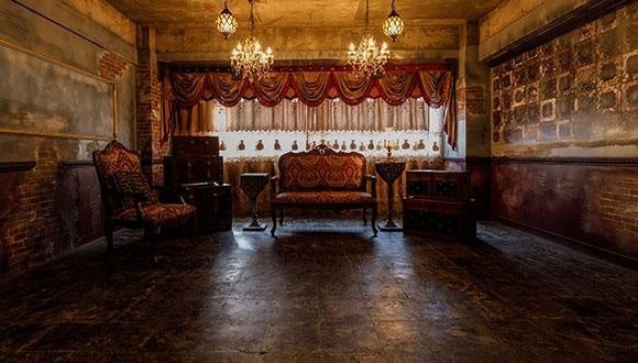 廃墟の洋館をイメージしたスタジオ。家具・小物はアンティーク調なもので統一しております。高さのある天井にはゴージャスなシャンデリアを3個設置。窓からは撮影に最適な自然光が差し込み、様々な表情をお楽しみいただけます!