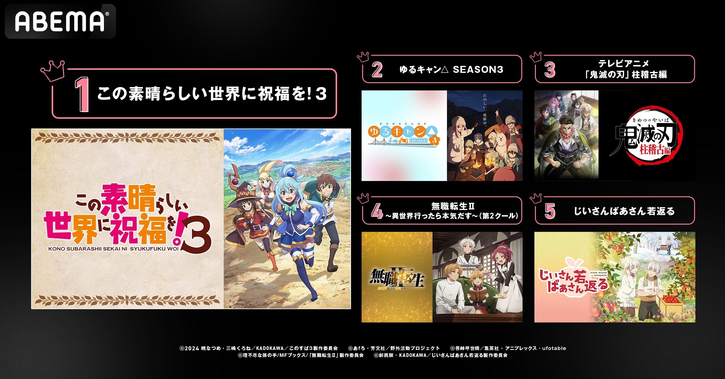 以上の「2024年新作春アニメ初速ランキング」上位作品は「ABEMA」のアニメチャンネルにて絶賛放送中です。