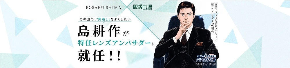 株式会社メガネトップ(本社:静岡市葵区、代表取締役社長:冨澤昌宏)が運営する眼鏡市場は、株式会社シンフィールド(東京都千代田区、代表取締役:谷口晋也)が発足し、島耕作が公式アンバサダーを務める「社会をよくする企業応援プロジェクト」に参画し、眼鏡市場の特任レンズアンバサダーとして、島耕作を起用しました。