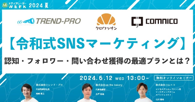 株式会社トレンド・プロ(本社:東京都港区、代表取締役社長:岡崎寛之、以下トレンド・プロ)は、メディアレーダー運営事務局主催 メディアレーダーWEEK2024夏「【令和式SNSマーケティング】認知・フォロワー・問い合わせ獲得の最適プランとは?」内「SNS運用担当・SNS広告担当者必見!インフルエンサー漫画家コラボで消費者に届くプロモーション!」に登壇します。