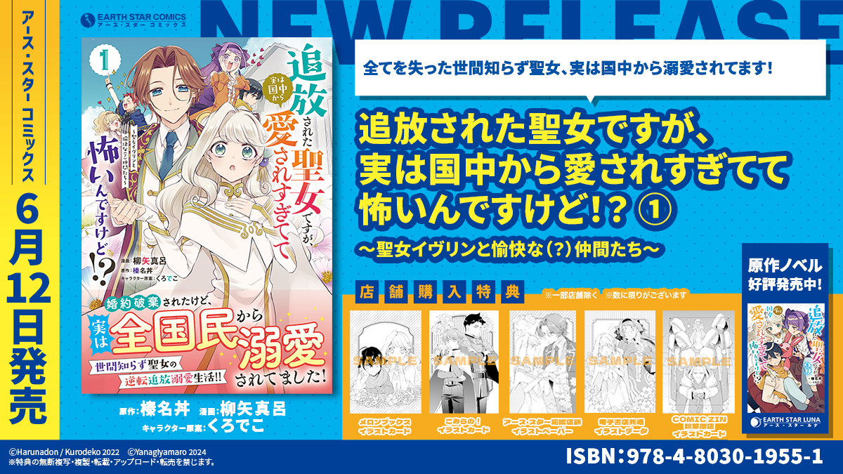 現在コミック アース・スター公式サイトにて連載中の人気作品『追放された聖女ですが、実は国中から愛されすぎてて怖いんですけど!?~聖女イヴリンと愉快な(?)仲間たち~』(原作:榛名丼 漫画:柳矢真呂 キャラクター原案:くろでこ)第1巻を6月12日(水)に発売いたします。