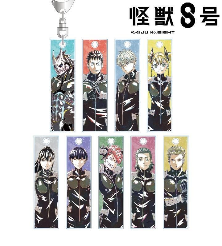 怪獣8号、日比野カフカ、市川レノ、四ノ宮キコル、亜白ミナ、保科宗四郎、古橋伊春、出雲ハルイチ、神楽木葵のイラスト、エンブレム、キャラクター名を新たなタッチで魅力的に表現し、スティック状のアクリルキーホルダーに仕上げました。