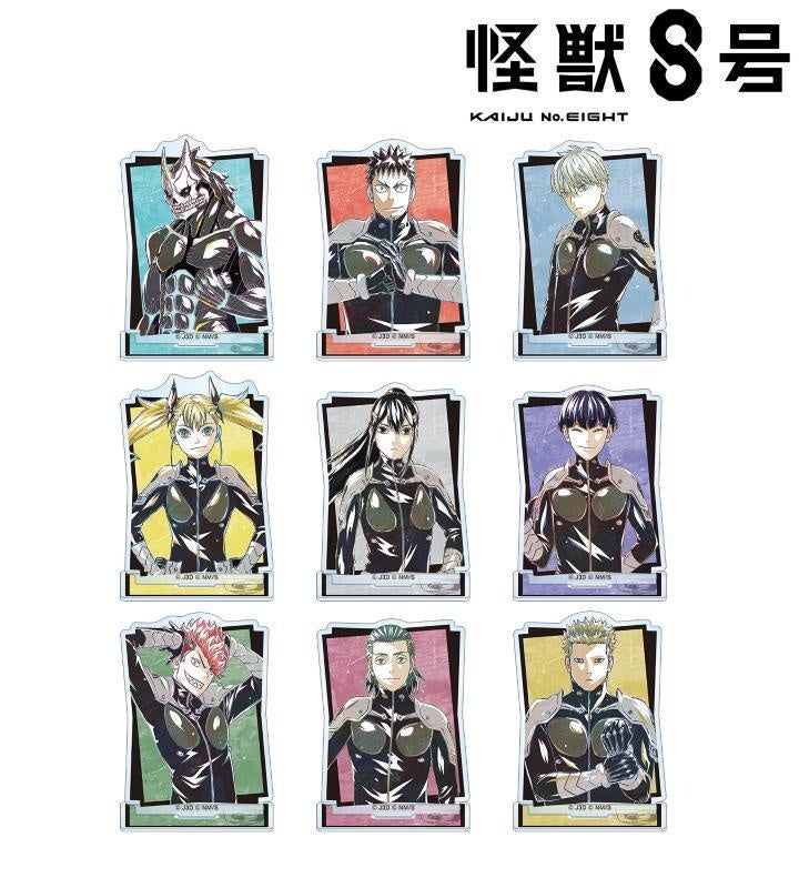 怪獣8号、日比野カフカ、市川レノ、四ノ宮キコル、亜白ミナ、保科宗四郎、古橋伊春、出雲ハルイチ、神楽木葵のイラストを新たなタッチで魅力的に表現し、アクリルスタンドに仕上げました。