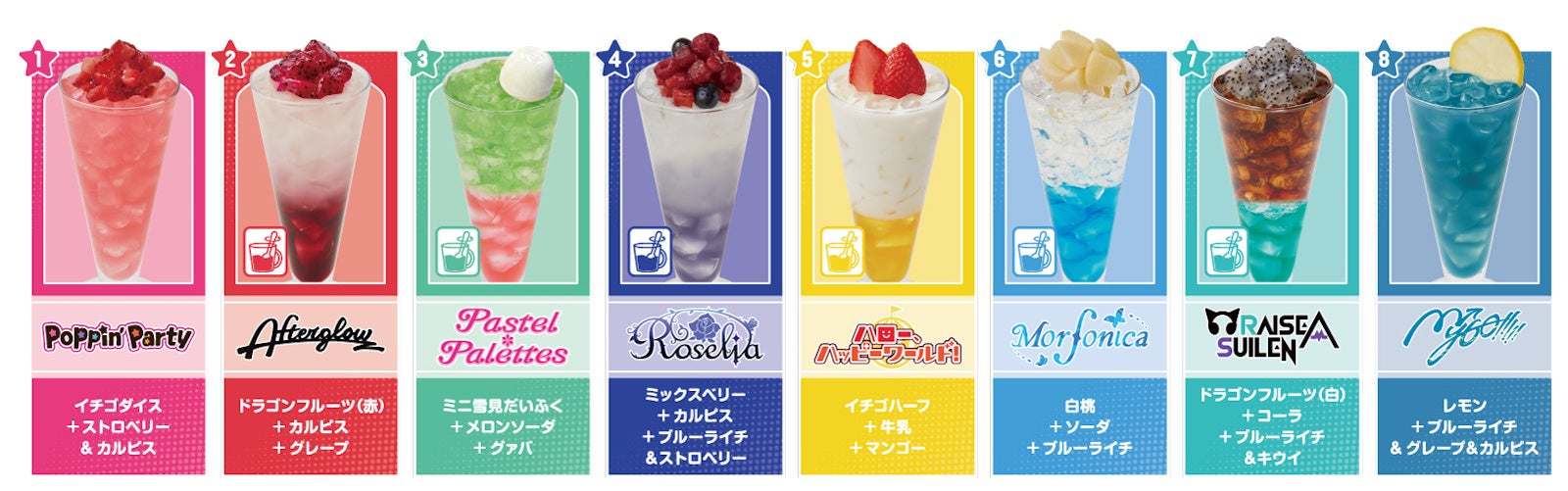 コラボドリンクは、「Poppin’Party」「Afterglow」「Pastel*Palettes」「Roselia」「ハロー、ハッピーワールド!」「Morfonica」「RAISE A SUILEN」「MyGO!!!!!」をイメージした全8種をご用意します。