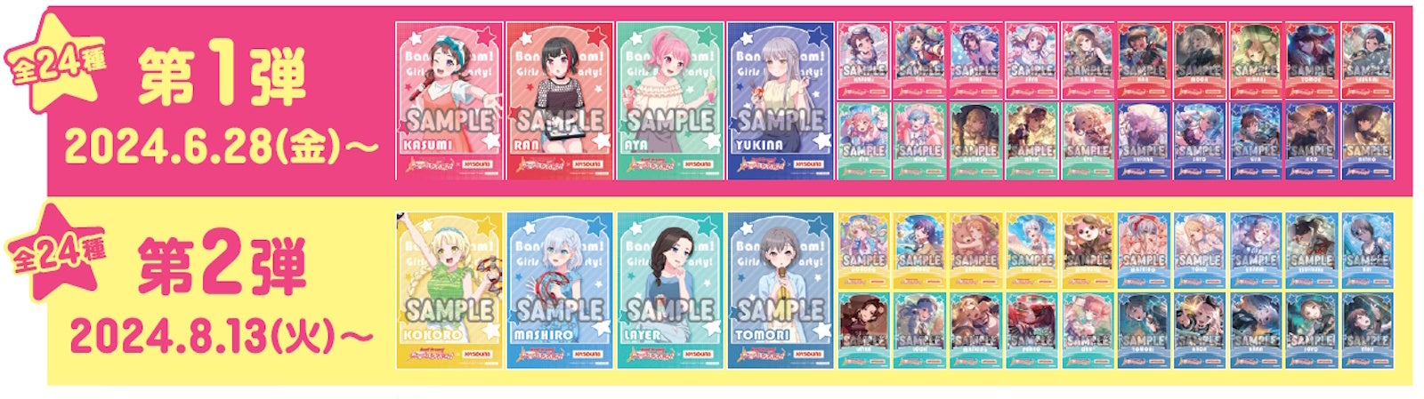 コラボドリンクは、「Poppin’Party」「Afterglow」「Pastel*Palettes」「Roselia」「ハロー、ハッピーワールド!」「Morfonica」「RAISE A SUILEN」「MyGO!!!!!」をイメージした全8種をご用意します。注文特典として、コラボドリンク1品ご注文につき、オリジナルポストカード全48種【第1弾:全24種/第2弾:全24種】の中からランダムで1枚プレゼントします。