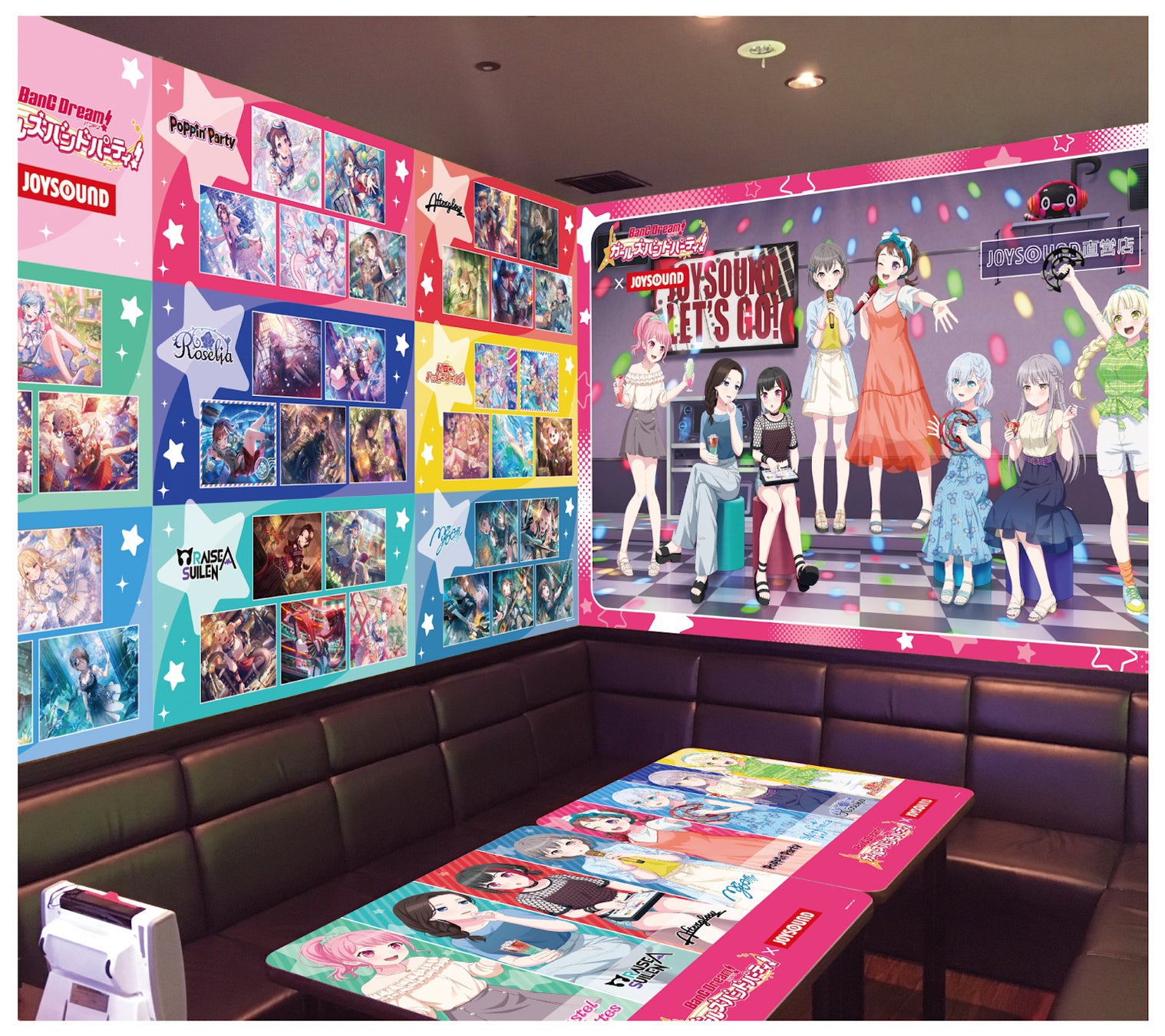カラオケコラボルームは、ルーム内の壁面やテーブル、ドアに至るまで、「バンドリ! ガールズバンドパーティ!」の世界観で彩られ、ファンには堪らない空間となっております。