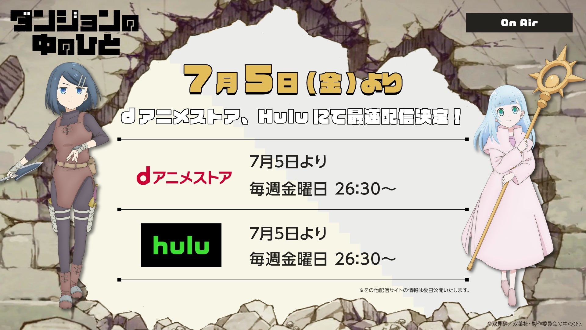 TVアニメ『ダンジョンの中のひと』が、7月5日(金)より毎週金曜日26:30から、dアニメストア・Huluにて最速先行配信されることが決定しました!その他の配信サイトの情報も後日公開いたします。
