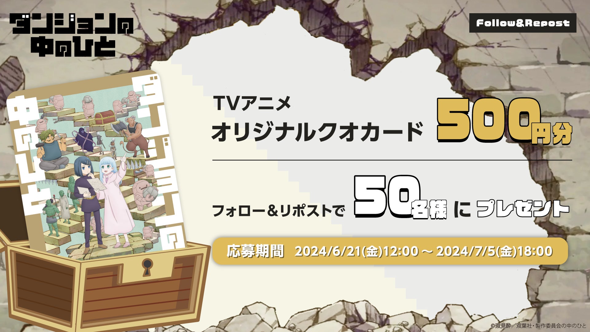 さらに、7月5日(金)からの放送を記念して、TVアニメ『ダンジョンの中のひと』オリジナルクオカードプレゼントキャンペーンを開始しました!キービジュアルがデザインされたオリジナルクオカード(500円分)が50名様に当たります!