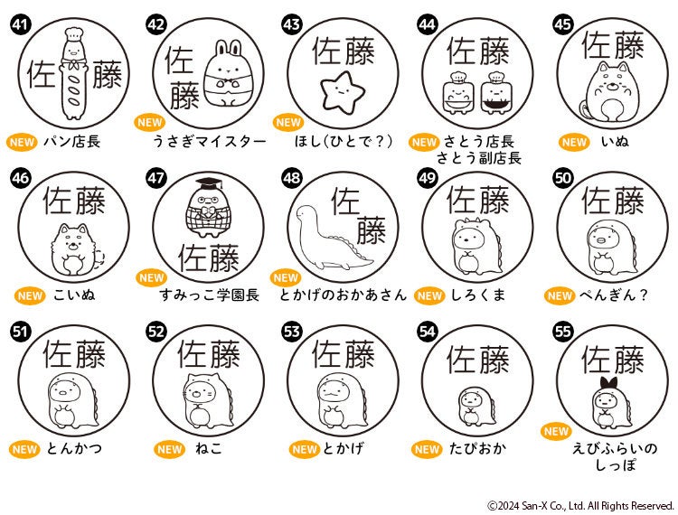 イラストはこちらの55種類。これまでの40種類のすみっコにくわえて、パン店長、うさぎマイスター、ほし(ひとで?)、さとう店長・さとう副店長、いぬ、こいぬ、すみっコ学園長、とかげのおかあさん、きょうりゅうのきぐるみを着たすみっコなど15種類があらたに登場しました。