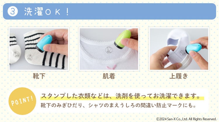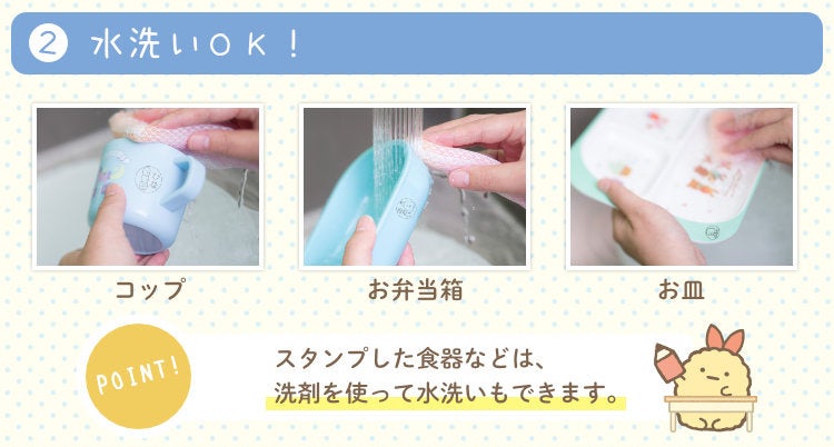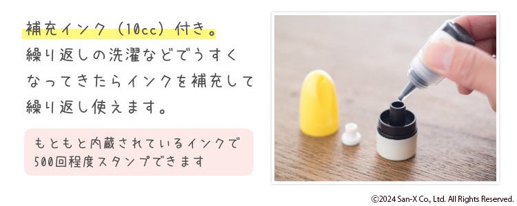 「すみっコぐらし もちものスタンプ」は、布やプラスチックなどあらゆる持ちものにスタンプOK。特殊な耐水性のインクを使っているため、洗濯や洗い物をしても落ちにくいのが特徴です(洗濯などを繰り返し、もし薄くなってきましたら再度スタンプし直してください)。