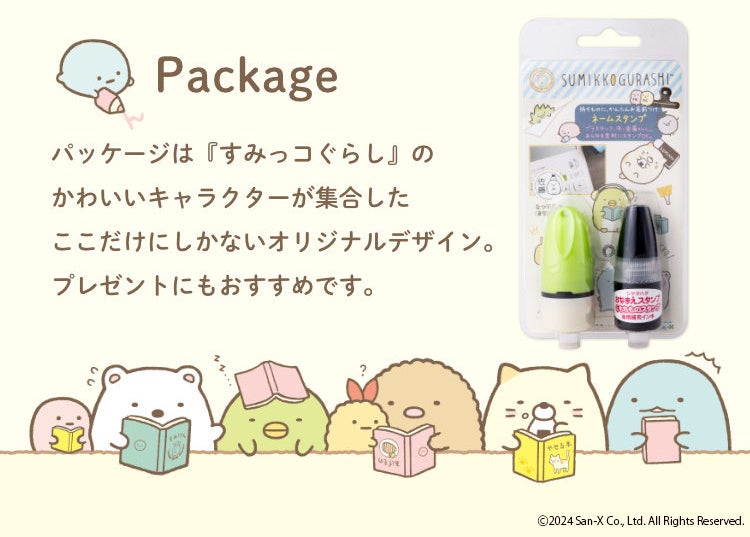 すみっコぐらしファンにはたまらない、とってもかわいいオリジナルパッケージに入れてお届け。プレゼントにもぴったりです(10cc入り補充インク1本つき。1回の補充で500回程度のスタンプができます)。