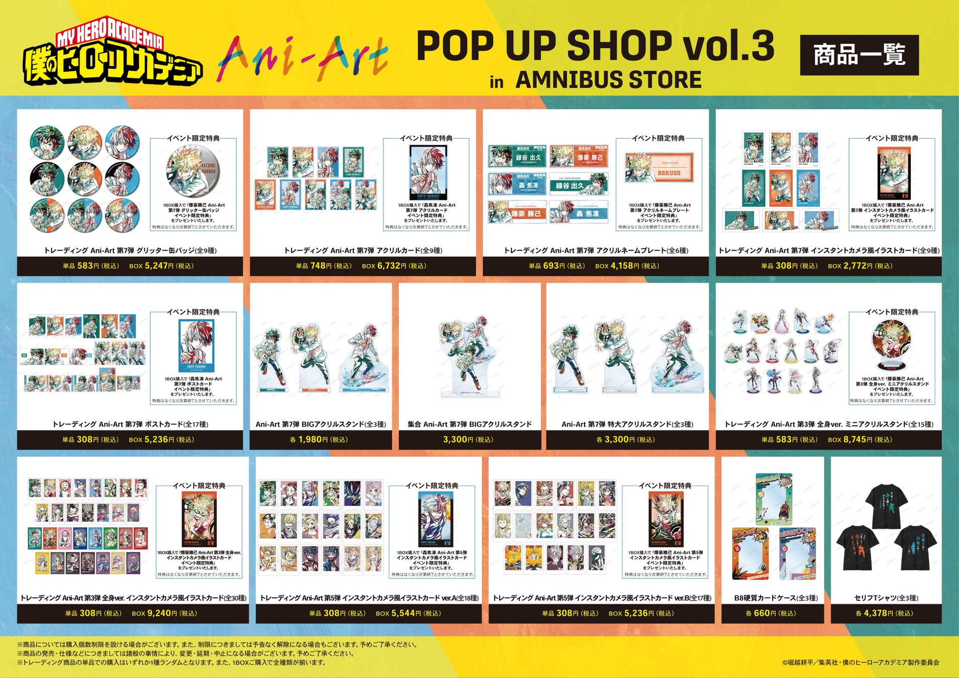 今回のイベントでは、TVアニメ『僕のヒーローアカデミア』より新規Ani-Artイラストを使用したグッズを多数先行販売する他、AMNIBUS STORE購入特典の配布を予定しております。