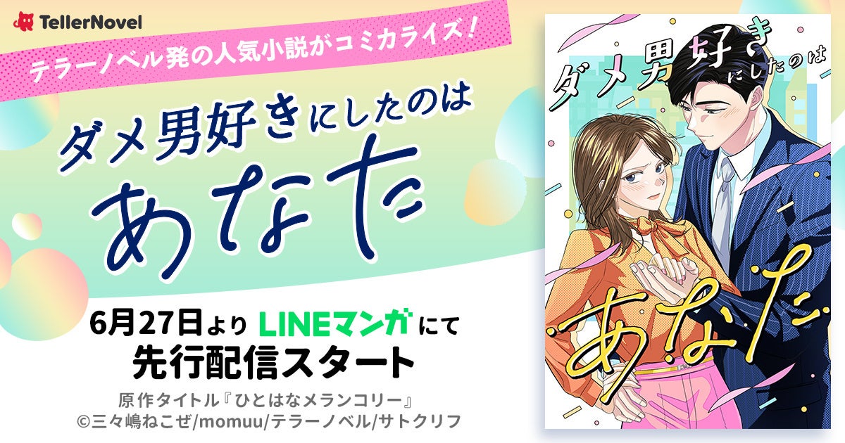 株式会社テラーノベル(本社:東京都港区、代表取締役社長:蜂谷宣人)はこの度、累計DL数760万(※)の小説共有アプリ「テラーノベル( https://teller.jp/ )」発の人気小説『ひとはなメランコリー』が株式会社サトクリフ(本社:東京都千代田区、代表取締役社長:加藤勝)によりWebtoon『ダメ男好きにしたのはあなた』としてコミカライズされ、6月27日よりLINEマンガにて先行配信を開始することをお知らせいたします。