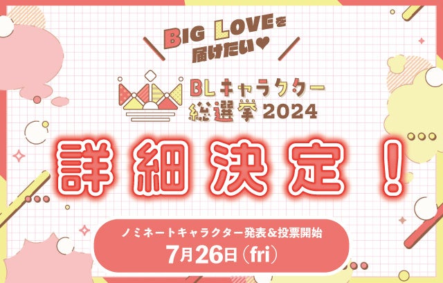 ノミネートキャラクターの発表と投票開始は 2024年7月26日(金) ! BL作品への愛を深めたり、新たな作品との出会いの場として、ぜひ奮ってご参加ください♥