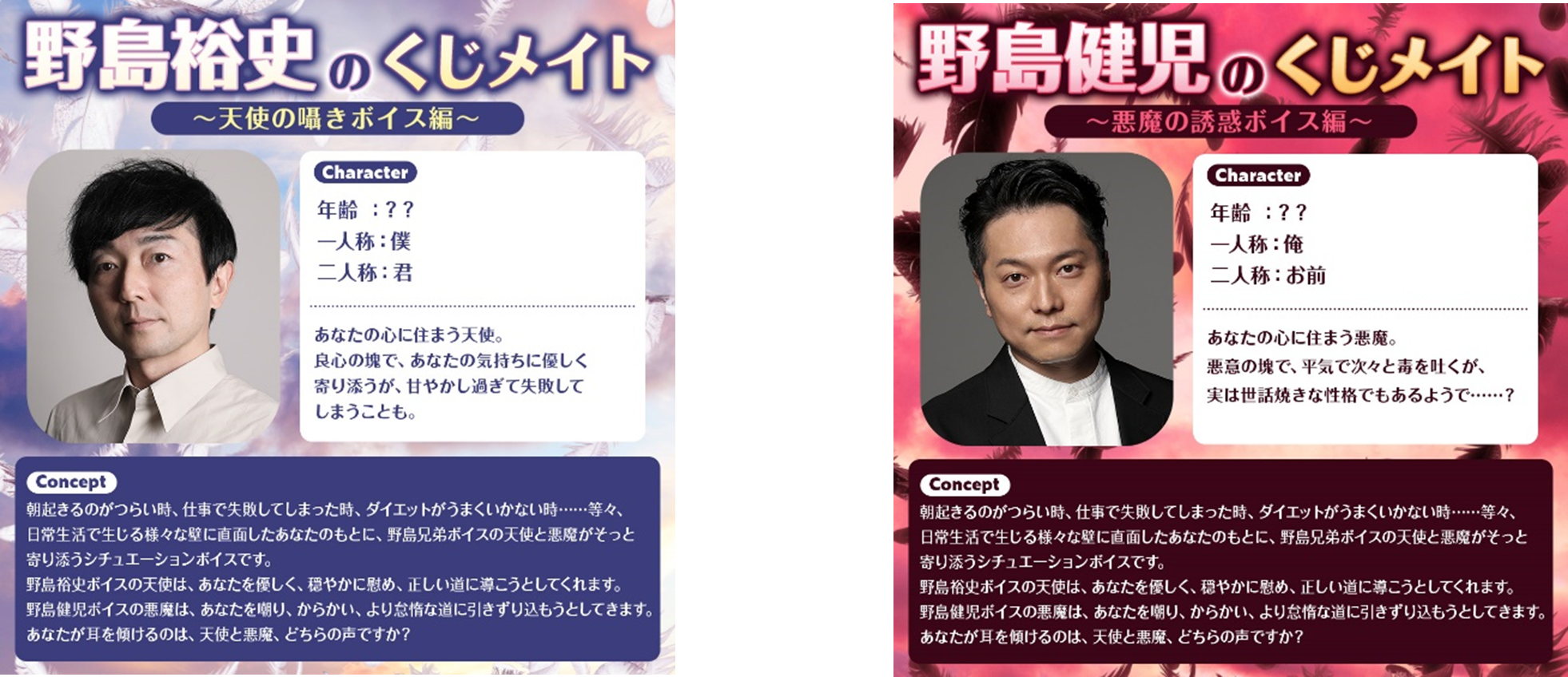 朝起きるのがつらい時、仕事で失敗してしまった時、ダイエットがうまくいかない時……等々、日常生活で生じる様々な壁に直面したあなたのもとに、野島兄弟ボイスの天使と悪魔がそっと寄り添うシチュエーションボイスです。野島裕史ボイスの天使は、あなたを優しく、穏やかに慰め、正しい道に導こうとしてくれます。野島健児ボイスの悪魔は、あなたをあざけり、からかい、より怠惰な道に引きずり込もうとしてきます。あなたが耳を傾けるのは、天使と悪魔、どちらの声ですか?