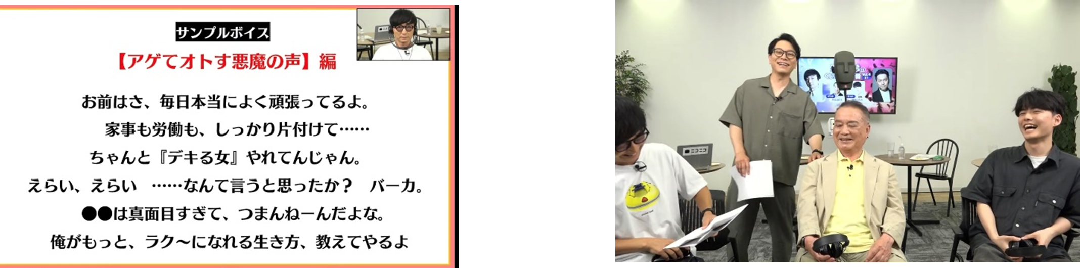 続いては健児のサンプル収録。「頑張って~」と透也が父親(健児)を応援する微笑ましい一幕も。健児は怠惰の道に引きずり込む、クールでカッコイイボイスを堪能します。透也は「お父さんの声どうだった?」と聞かれると「いやあ……新感覚って感じ」と照れて話す中、「この距離で父親の声を聞くなんて、生まれたときくらいだよね」と昭生に言われ、「そうだね、赤ちゃん以来かも」とうなずき、笑いを誘いました。視聴者も「全員イケボすぎる」「この家族楽しすぎ!」と大盛り上がりでした。