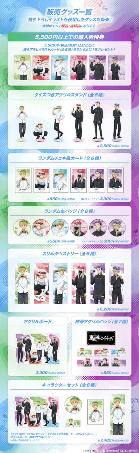 TVアニメ『東京リベンジャーズ』に登場する花垣武道・佐野万次郎・松野千冬・三途春千夜・灰谷蘭・灰谷竜胆の6名の描き下ろしイラストを使用した限定グッズを受注販売します。