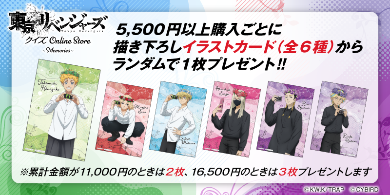 「東京リベンジャーズクイズ ONLINE STORE ~MEMORIES~」のオープンを記念して、オリジナルデザインのイラストカード全種類セットが抽選で10名様に当たるキャンペーンを開催します。