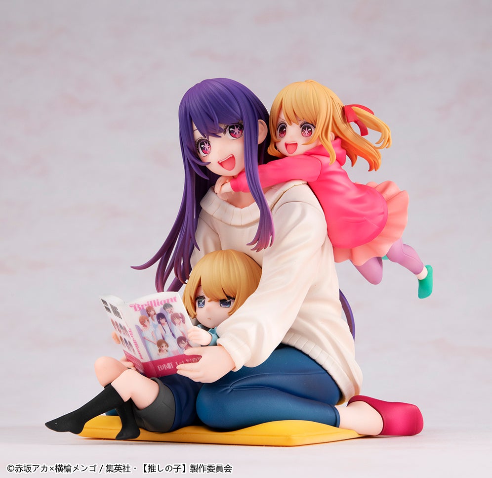 楽しげにアイに飛び乗るルビー、笑顔で迎えるアイ、そしてアイに抱っこされたまま我関せずのアクアと、三者三様の仕草を丁寧に表現。アクアが持っているB小町の写真集など、細部までこだわっております。優しい時間を切り取ったような家族の日常を、是非お手元にお迎えください。