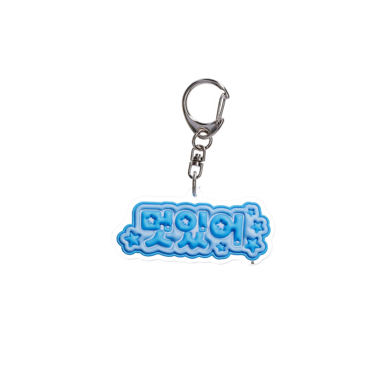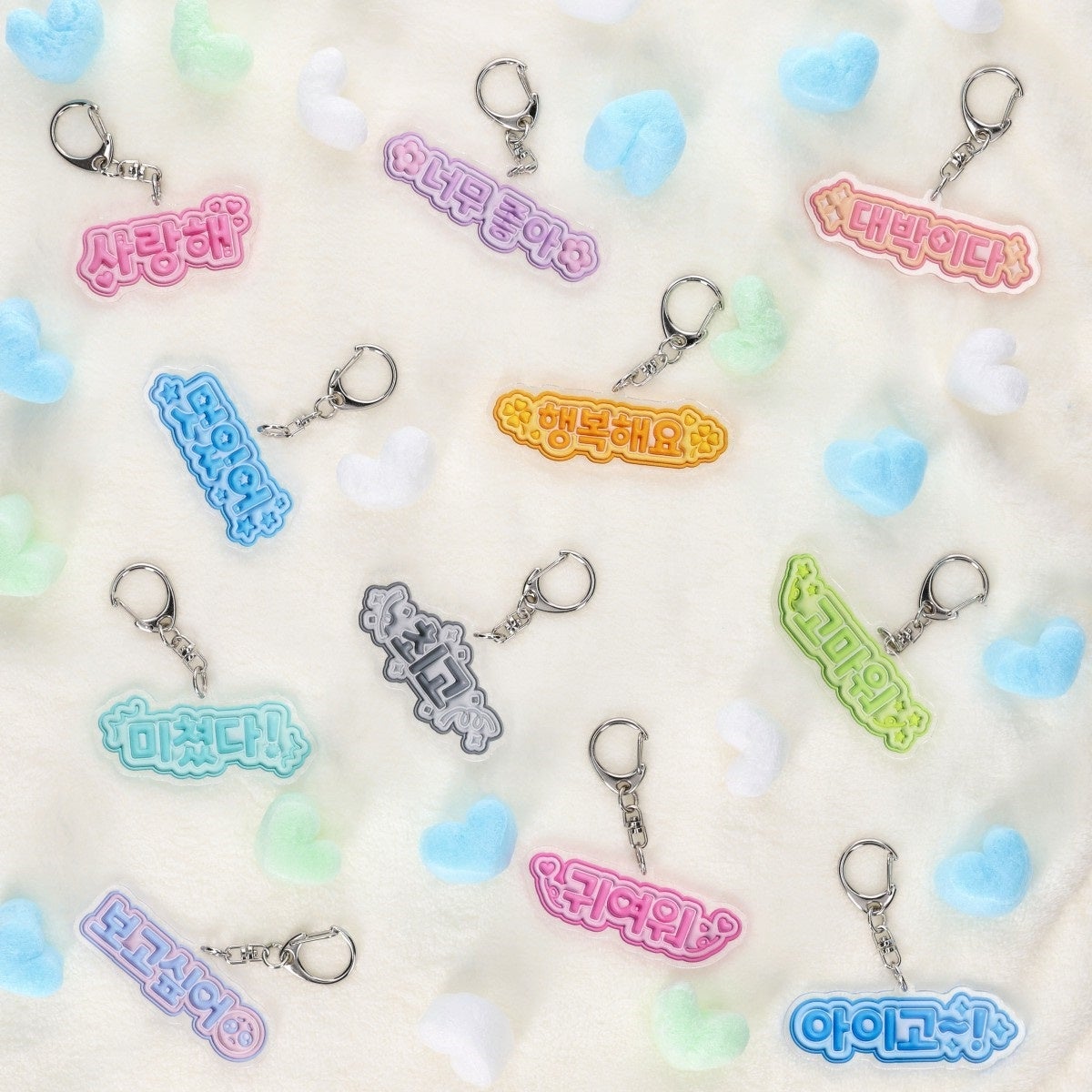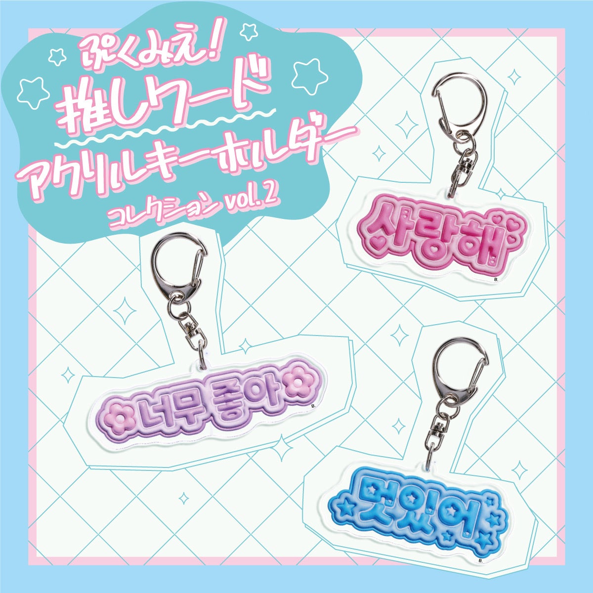 推しのぬいぐるみやアクリルスタンド、トレカと一緒に添えて、写真撮影にも使用できるアクリルキーホルダーとなっており、vol.1は日本語のワードを12種類、vol.2はハングルで11種類を収録しております。