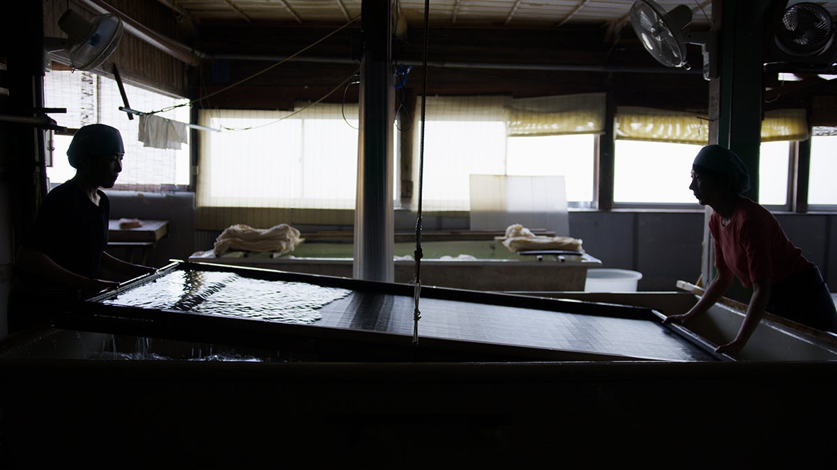 1865年。幕末の大混乱期に、現・岩野平三郎製紙所は創業しました。幕末の大混乱期です。明治時代、初代・岩野平三郎が、絵画制作に優れた「雲肌麻紙」を開発。横山大観らに愛用されることになります。四代目となる現在も、伝統的な原料を用い、長辺3メートルを超える紙を制作。日本で唯一の大判手漉き和紙工場です。