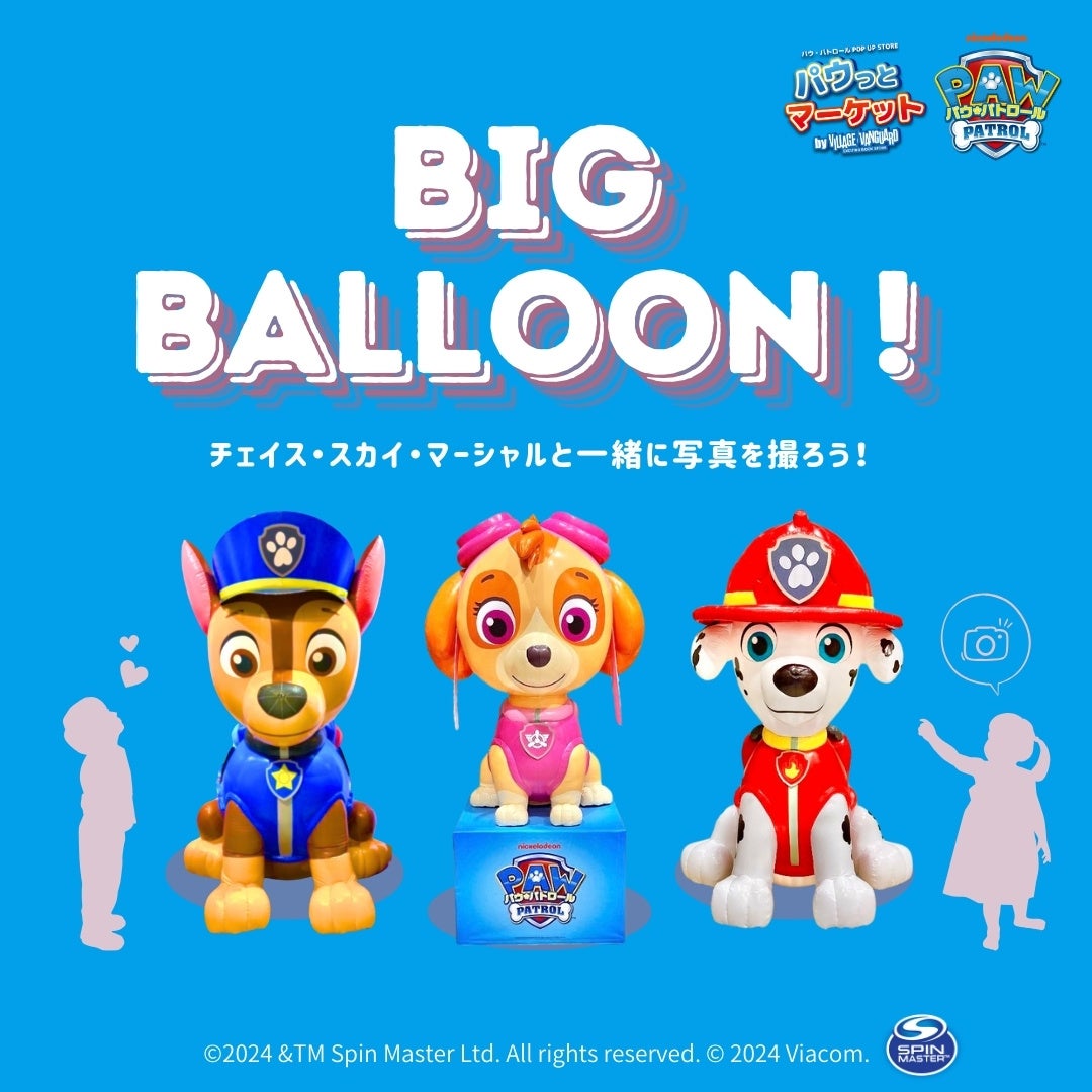 パウッとマーケットでしか出会えない、チェイス・マーシャル・スカイのBIGバルーン。写真映え間違い無しの大きなパウ・パトロールの仲間たちと、ぜひ一緒に写真や動画を撮ってSNSでシェアしてください。