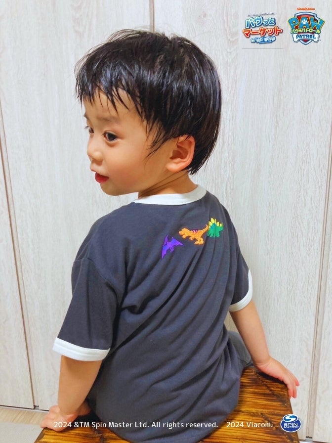 パウ・パトロールの仲間たちと恐竜たちがプリントされたTシャツは、流行りのリンガーデザインでおしゃれに大人っぽく決まります。後ろ姿もかっこいい!