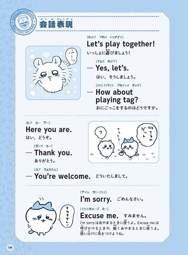 本書には該当の英単語を使った例文が掲載されています。例文には、ちいかわのストーリーが関連したものがたくさんあります。