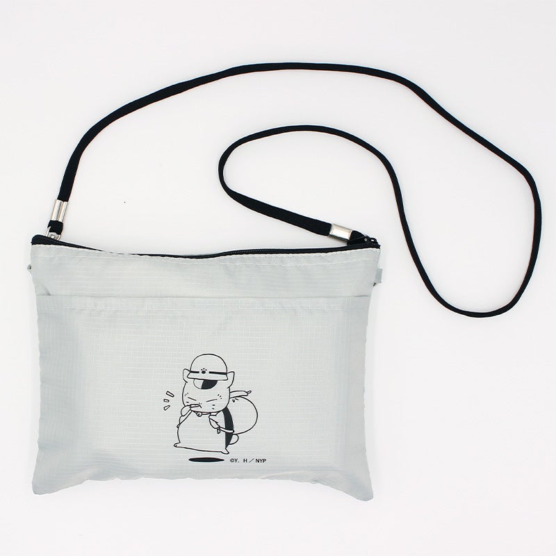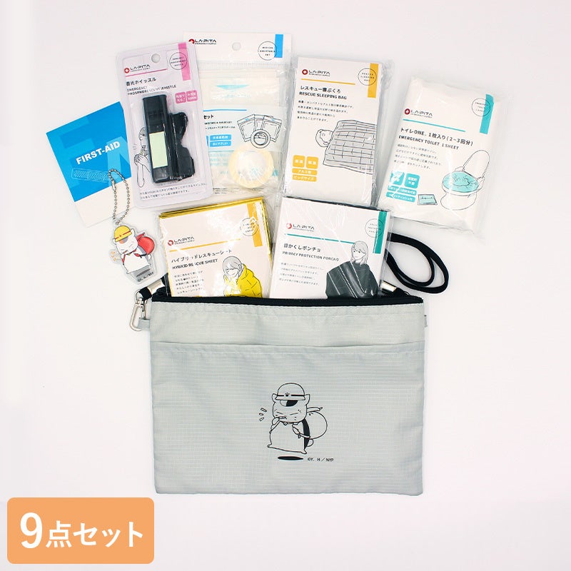 描き下ろしたニャンコ先生がデザインされた、持ち運びに便利なショルダーポーチと同柄のダイカットリフレクター、『LA・PITA』チョイスによる防寒[瞳萩1] f・防熱のレスキューシート、寝袋、携帯トイレや目かくしポンチョ、簡易救急セット、蓄光ホイッスル、絆創膏のお役立ちグッズが詰まった9点セットの防災グッズセットです。