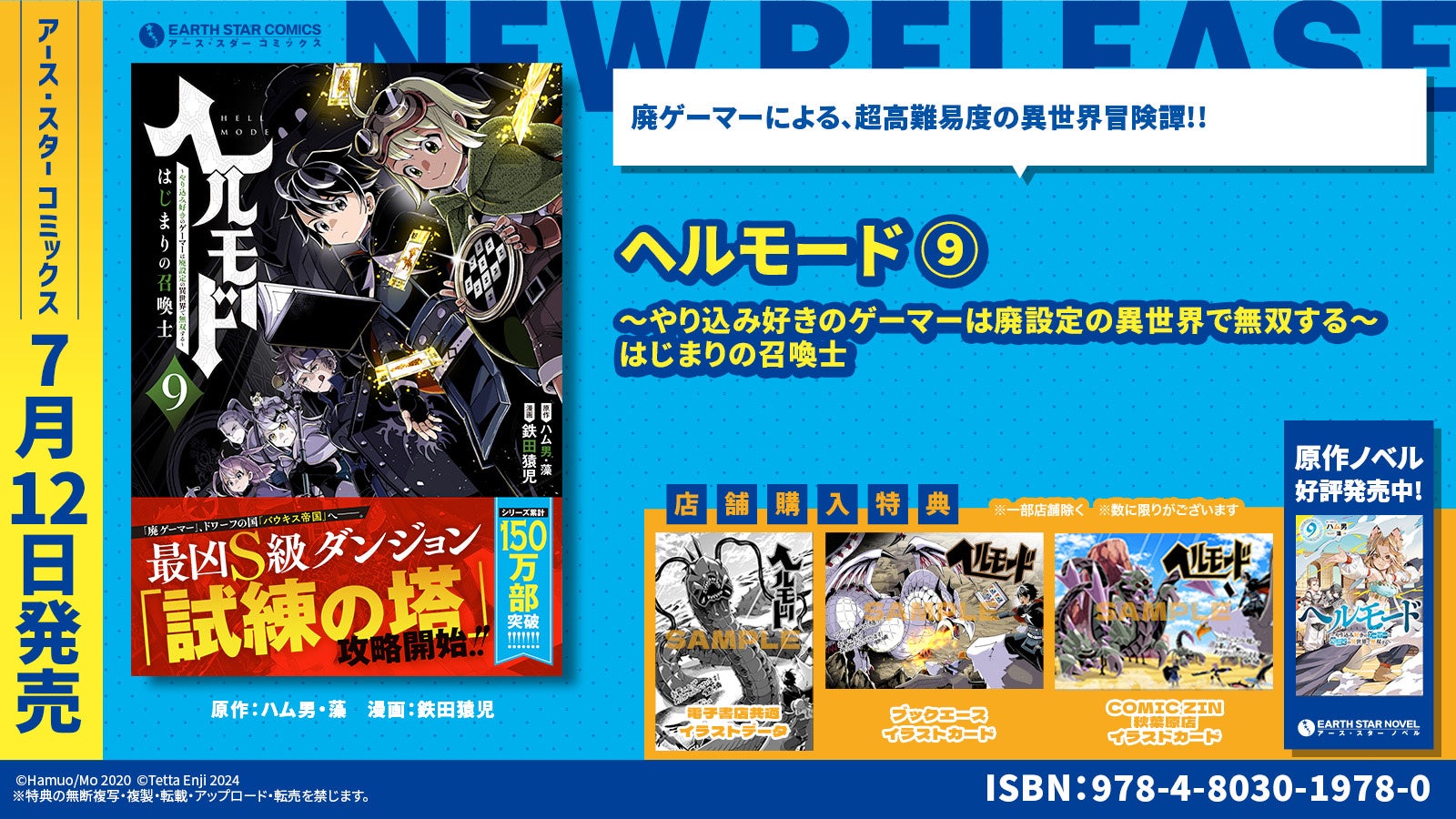現在コミック アース・スター公式サイトにて連載中の人気作品『ヘルモード ~やり込み好きのゲーマーは廃設定の異世界で無双する~はじまりの召喚士』第9巻(原作:ハム男・藻 漫画:鉄田猿児)を7月12日(金)に発売いたします。