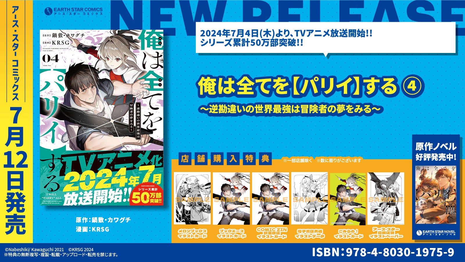 現在コミック アース・スター公式サイトにて連載中の人気作品『俺は全てを【パリイ】する ~逆勘違いの世界最強は冒険者の夢をみる~』第4巻(原作:鍋敷・カワグチ 漫画:KRSG)を7月12日(金)に発売いたします。