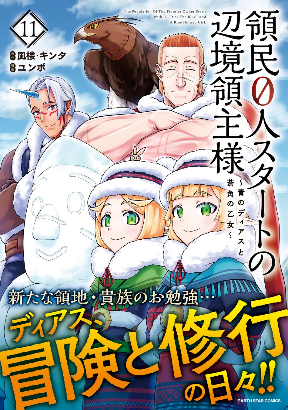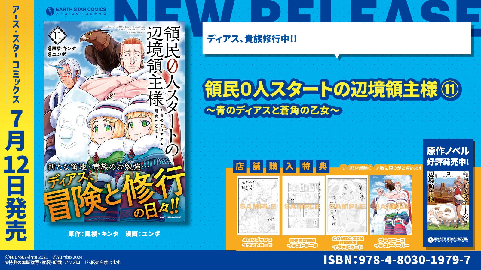 現在コミック アース・スター公式サイトにて連載中の人気作品『領民0人スタートの辺境領主様 ~青のディアスと蒼角の乙女~』第11巻(原作:風楼・キンタ 漫画:ユンボ)を7月12日(金)に発売いたします。
