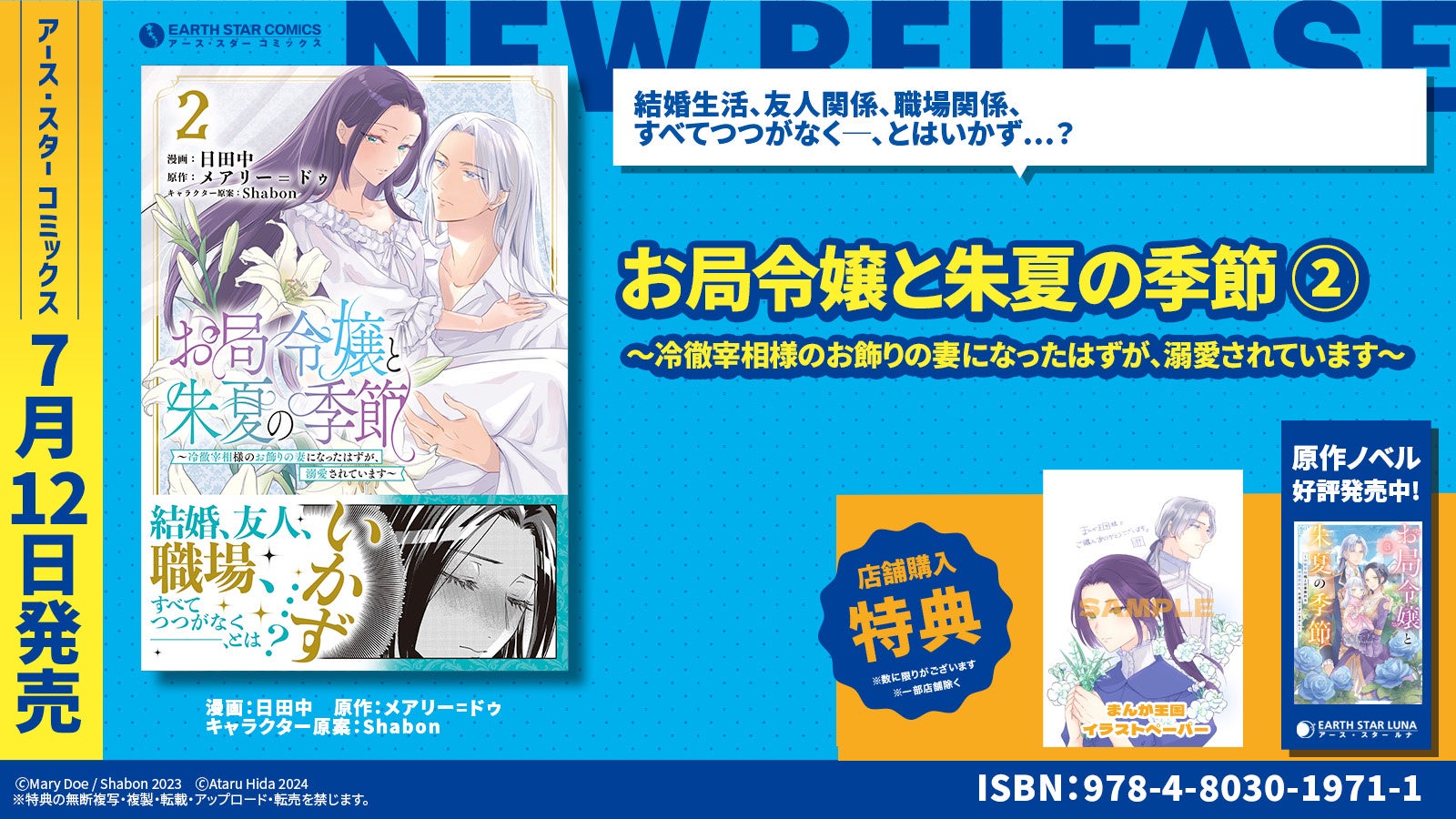 現在コミック アース・スター公式サイトにて連載中の人気作品『お局令嬢と朱夏の季節 ~冷徹宰相様のお飾りの妻になったはずが、溺愛されています~』(漫画:日田中 原作:メアリー=ドゥ キャラクター原案:Shabon)第2巻を7月12日(金)に発売いたします。