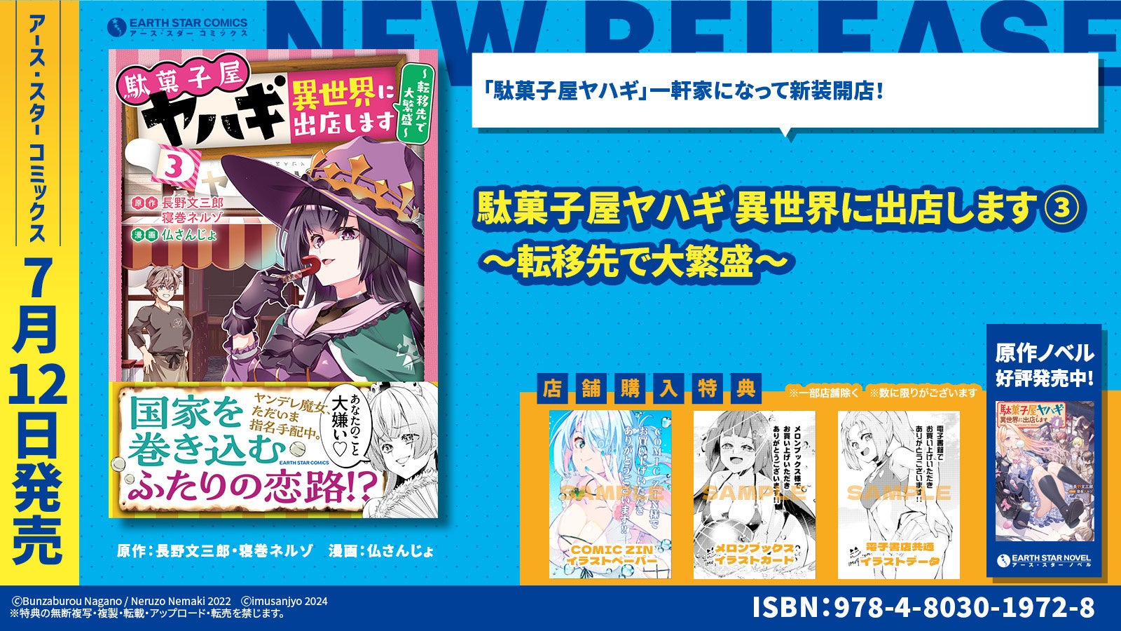 現在コミック アース・スター公式サイトにて連載中の人気作品『駄菓子屋ヤハギ 異世界に出店します ~転移先で大繁盛~』第3巻(原作:長野文三郎・寝巻ネルゾ 漫画:仏さんじょ)を7月12日(金)に発売いたします。