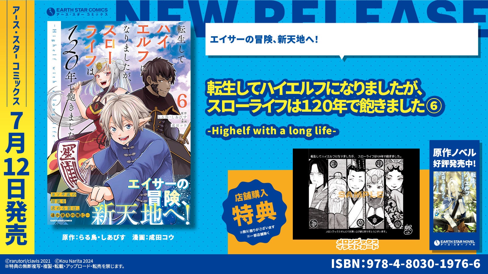 現在コミック アース・スター公式サイトにて連載中の人気作品『転生してハイエルフになりましたが、スローライフは120年で飽きました -Highelf with a long life-』第6巻(原作:らる鳥・しあびす 漫画:成田コウ)を7月12日(金)に発売いたします。