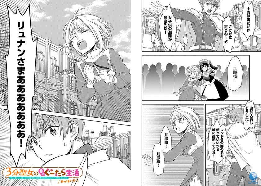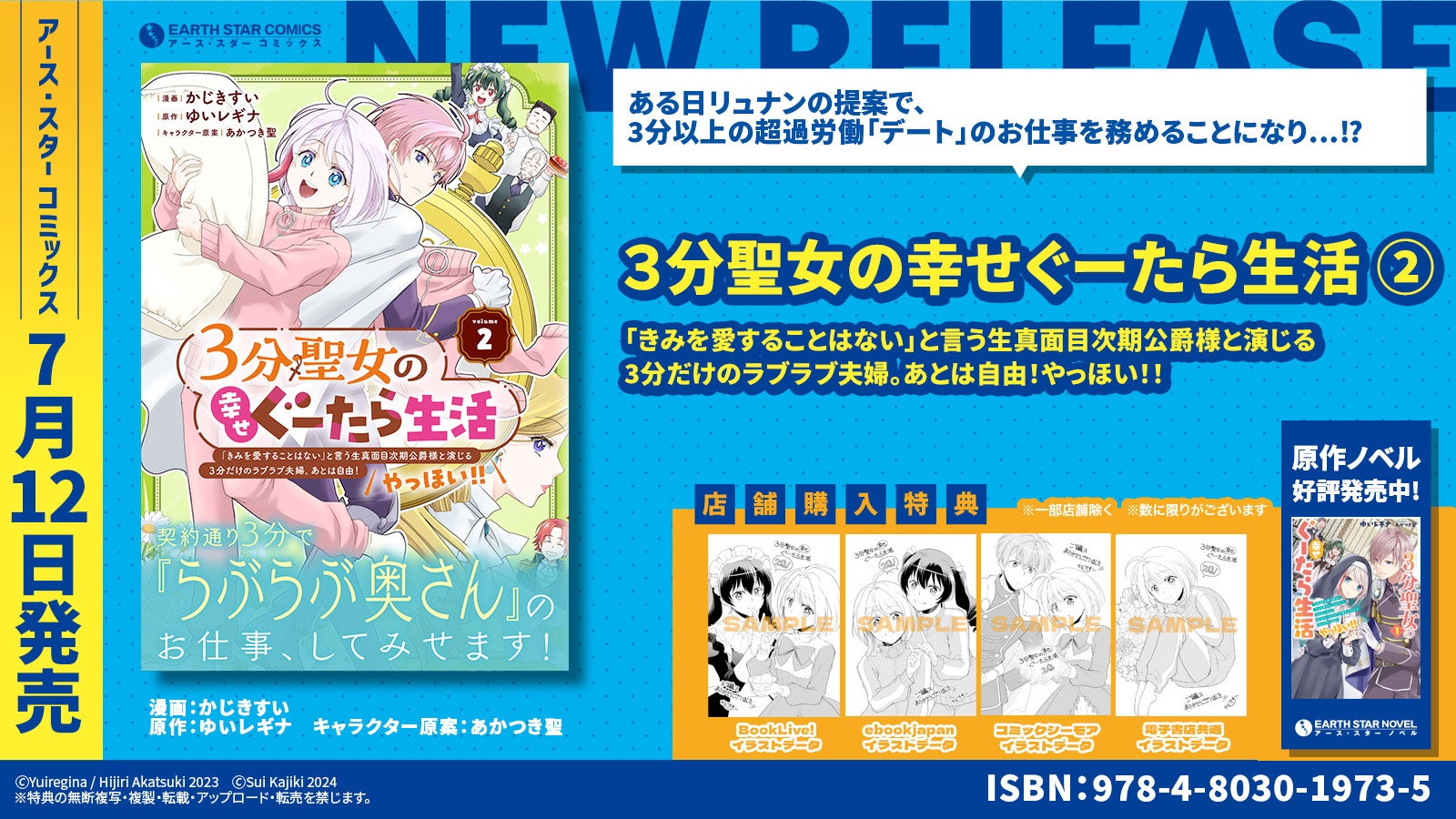 現在コミック アース・スター公式サイトにて連載中の人気作品『3分聖女の幸せぐーたら生活 「きみを愛することはない」と言う生真面目次期公爵様と演じる3分だけのラブラブ夫婦。あとは自由!やっほい!!』第2巻(漫画:かじきすい 原作:ゆいレギナ キャラクター原案:あかつき聖)を7月12日(金)に発売いたします。