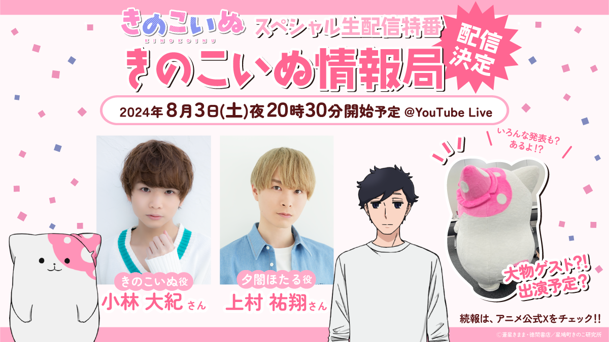 来る8月3日(土)に、きのこいぬ役の小林大紀さん、ほたる役の上村祐翔さんによる、スペシャル生配信特番が決定!日頃から仲良しの二人が、きのこいぬとほたるというバディとして、『きのこいぬ』の世界の魅力をお伝えします!そして特別“大物“ゲストとして<きのこいぬ>も参戦予定です!