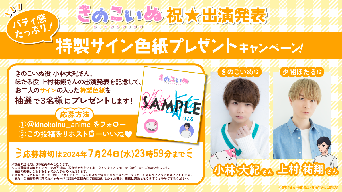①祝★出演発表!きのこいぬ役小林大紀さん&ほたる役上村祐翔 さん“バディ感たっぷり!特製サイン色紙”プレゼント!出演発表を記念して、お二人のサインの入ったバディ感たっぷりの特製色紙を抽選で3名様にプレゼントいたします。