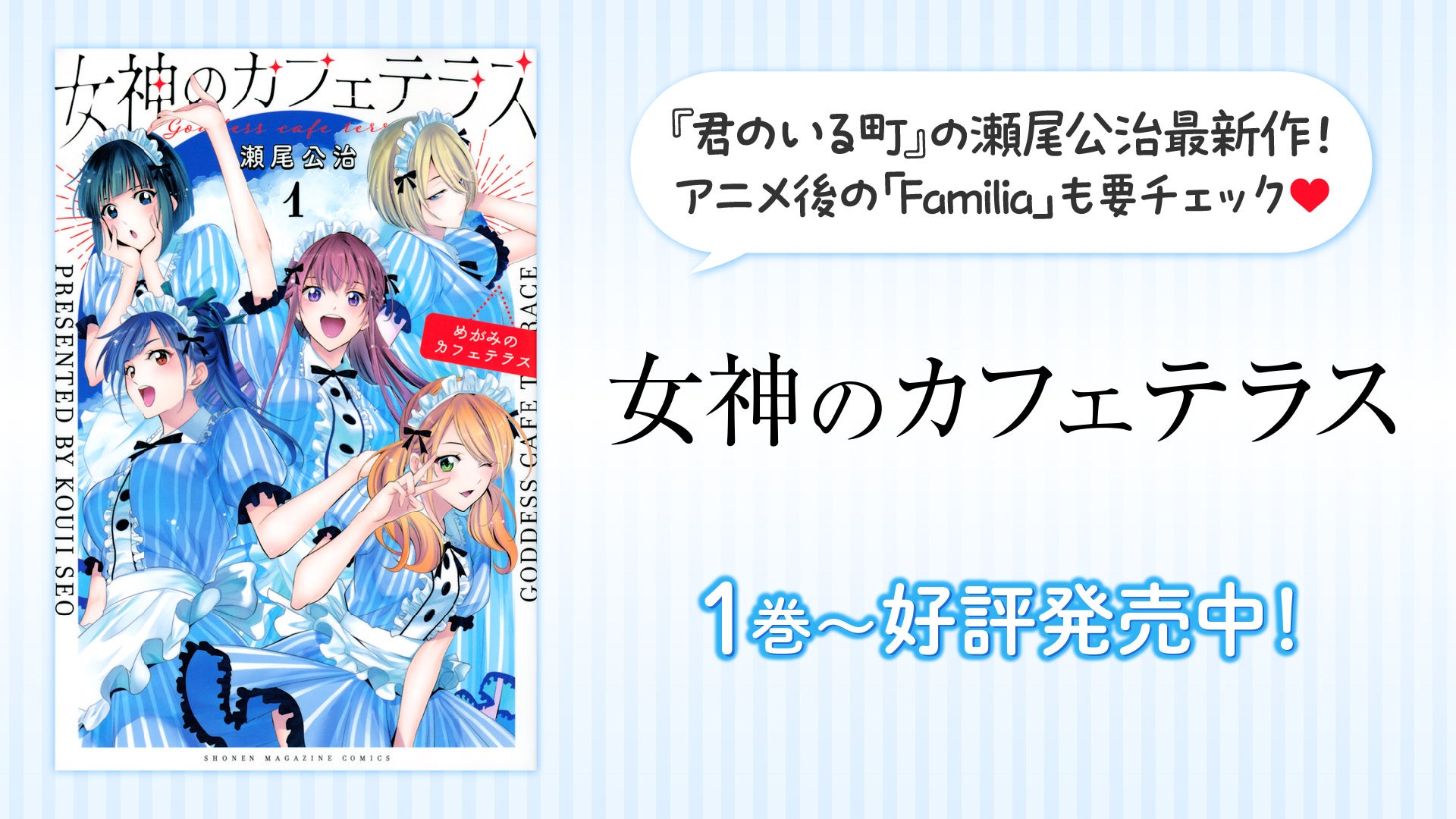 「君のいる町」「風夏」など数々のヒット作を生み出してきた、瀬尾公治先生の最新作「女神のカフェテラス」の最新第16巻が 7月17日より大好評発売中!これを記念して、講談社が運営するYouTubeチャンネル「フル☆アニメTV」にて、TVアニメ「君のいる町」全12話を期間限定で一挙無料配信いたします。本日7月19日から8月31日までの期間限定配信となりますので、ぜひお楽しみください!
