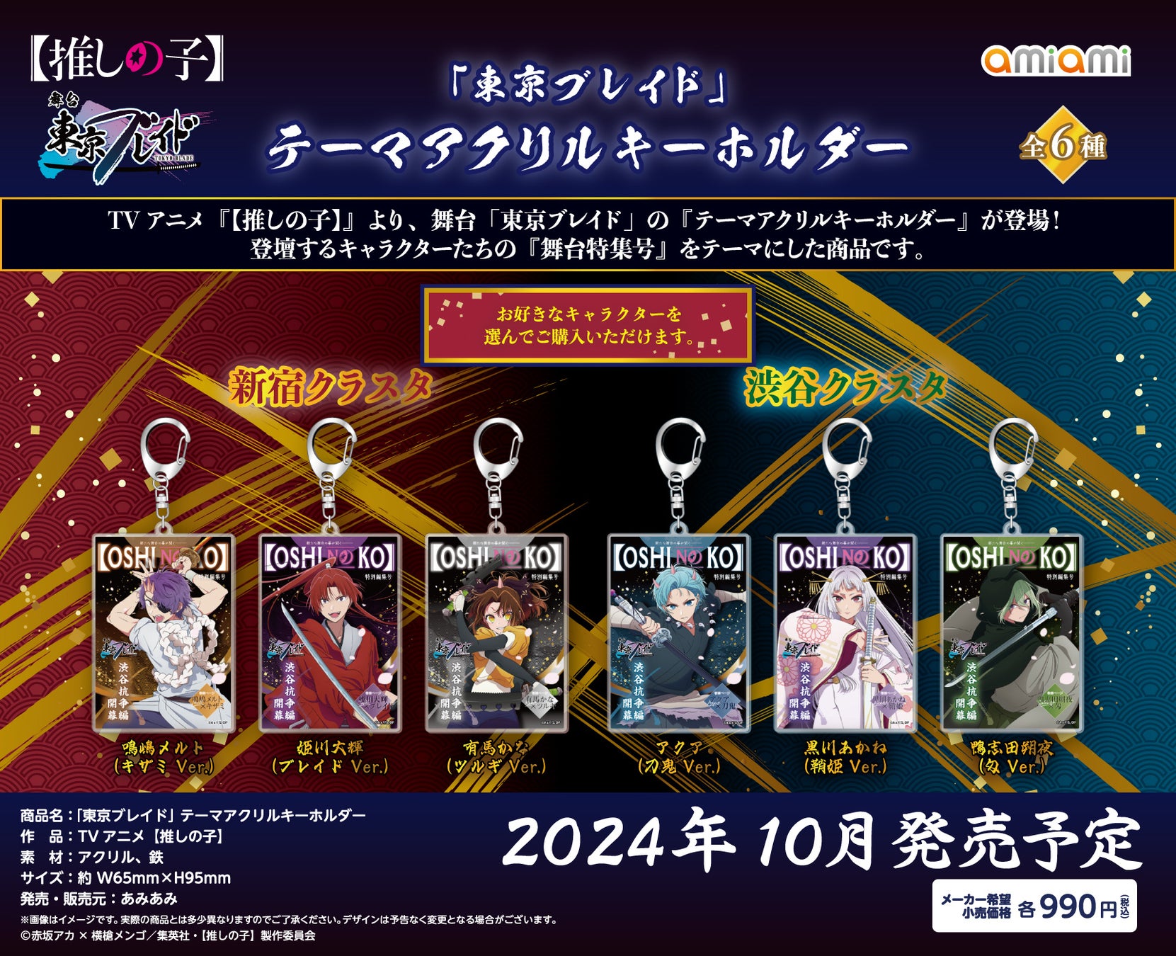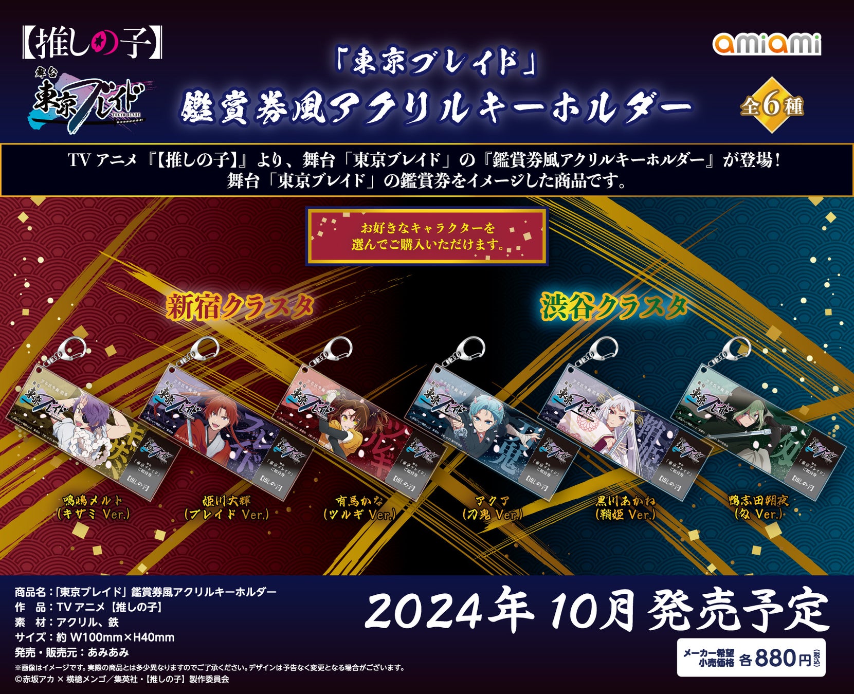 フィギュア&ホビー通販大手の「あみあみ」を運営する、大網株式会社(本社・東京都文京区)は、TVアニメ『【推しの子】』より、舞台 「東京ブレイド」の「鑑賞券風アクリルキーホルダー」「テーマB2タペストリー」「テーマアクリルキーホルダー」を、2024年10月予定で発売いたします。